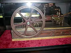 L'application industrielle de la machine à vapeur de James Watt (présentée ci-dessus) commence à partir de 1775, après que James Watt s'est associé avec Matthew Boulton. Leur démarche de commercialisation est de faire contrat avec un client équipé d'une machine ancienne et de financer le remplacement par une machine de Watt. Watt brevette plusieurs autres inventions comme la machine rotative et surtout la machine à double effet (1783), dans laquelle le cylindre reçoit la vapeur alternativement par le bas et par le haut, ainsi qu'un régulateur à boules ou centrifuge (1788) assurant une vitesse constante au moteur[8].