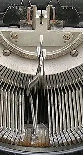 - Le pied de la barre à caractère est mobile dans une des fentes du segment au moyen d'une biellette qui agit quand le ou la dactylo tape sur une touche.