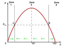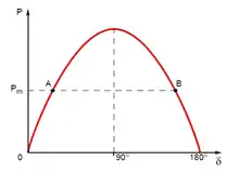 Ce générateur reçoit une puissance mécanique, typiquement d'une turbine, notée Pm. À l'équilibre, la puissance entrante, mécanique, est égale à la puissance sortante, électrique. On néglige ici les pertes[13]. Pour cet équilibre deux angles internes sont possibles (cf. image).