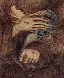 - Les auréoles ne sont pas en relief et rayonnées, comme celles plus innovantes présentes dans l'église supérieure et adoptées par tous les artistes ensuite dans les cycles de fresques.