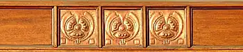 Elle est surmontée d'une frise de fleurs très stylisées et d'une corniche en bois affichant le nom du magasin en lettres inspirées du design de la Sécession viennoise. Cette corniche est supportée par deux consoles en bois partiellement ajourées.