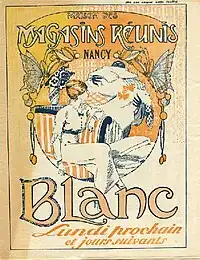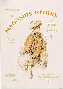 Enfin, cet important battage publicitaire de Mode[12] participe donc à l'uniformisation de l'habillement quotidien en France et à la diffusion de modèles esthétiques[9].Les Magasins Réunis sont sujets à ce phénomène et se réapproprient par exemple la figure de la Parisienne sur leurs affiches publicitaires ou leurs couvertures de catalogue. Cette figure, qui veut véritablement incarner la femme française élégante durant la Belle Époque (une statue dénommée "La Parisienne" trône à l'entrée de l'exposition universelle de 1900)[13] est notamment reprise par les Magasins Réunis sur la couverture d'un catalogue de vente pour la saison d'Hiver 1908-1909. Elle devient ici une figure féminine anonyme, particulièrement élégante, qui sert donc de prétexte pour présenter un modèle de la collection d'Hiver disponible à la vente.