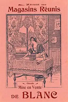 Durant le dix-neuvième siècle, les progrès de la chimie permettant d'abaisser les coûts de fabrication de l'Eau de Javel, la blancheur des textiles devint donc un véritable enjeu vis-à-vis de la population française. D'abord symbole de la pureté et réservé à une élite, la possibilité d'obtenir du textile véritablement blanc s'étendit alors à toute la population française, pour les vêtements autant que pour le linge de maison[21]. Il est intéressant de noter que sur certaines annonces publicitaires des Magasins Réunis, les expositions de blanc présentaient en effet des textiles blancs de toute sorte comme des trousseaux, plutôt reliés à la Mode et à la symbolique de pureté puisque généralement constitués à l'occasion d'un mariage ou d'une première communion[22] ou des produits comme des rideaux, alors associé à la symbolique de la santé, de l'hygiène d'un intérieur et d'un linge de maison sain.