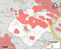Le retrait-gonflement des sols argileux est susceptible d'engendrer des dommages importants aux bâtiments en cas d’alternance de périodes de sécheresse et de pluie. 35,7 % de la superficie communale est en aléa moyen ou fort (67,4 % au niveau départemental et 48,5 % au niveau national). Sur les 236 bâtiments dénombrés sur la commune en 2019, 42 sont en aléa moyen ou fort, soit 18 %, à comparer aux 81 % au niveau départemental et 54 % au niveau national. Une cartographie de l'exposition du territoire national au retrait gonflement des sols argileux est disponible sur le site du BRGM[20],[Carte 3].