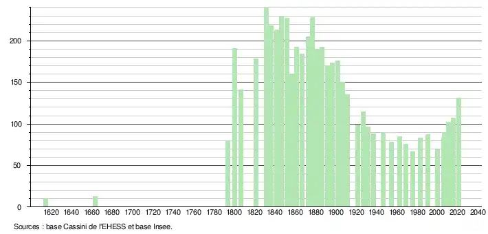 L'évolution du nombre d'habitants est connue à travers les recensements de la population effectués dans la commune depuis 1614. Pour les communes de moins de 10 000 habitants, une enquête de recensement portant sur toute la population est réalisée tous les cinq ans, les populations légales des années intermédiaires étant quant à elles estimées par interpolation ou extrapolation[34]. Pour la commune, le premier recensement exhaustif entrant dans le cadre du nouveau dispositif a été réalisé en 2005[35].