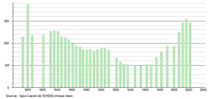 L'évolution du nombre d'habitants est connue à travers les recensements de la population effectués dans la commune depuis 1793. Pour les communes de moins de 10 000 habitants, une enquête de recensement portant sur toute la population est réalisée tous les cinq ans, les populations légales des années intermédiaires étant quant à elles estimées par interpolation ou extrapolation[17]. Pour la commune, le premier recensement exhaustif entrant dans le cadre du nouveau dispositif a été réalisé en 2006[18].