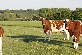 La race rouge des prés est la seule à être élevée et abattue pour fournir la viande d'appellation maine-anjou. | ||