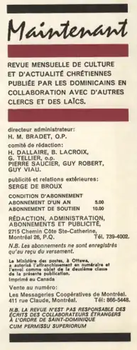 Les rédacteurs et collaborateurs de Maintenant représentent une élite intellectuelle reconnue et influente durant les années de la Révolution tranquille. Le cartouche du numéro 1 de la revue déclarait que Maintenant est « publiée par les dominicains en collaboration avec d’autres clercs et des laïcs »[20]. La liste qui suit reflète assez éloquemment cet engagement. Outre des dominicains et des clercs, on y retrouve des écrivains, des journalistes, des universitaires, des pasteurs et de futurs membres du gouvernement péquiste…