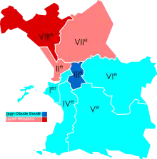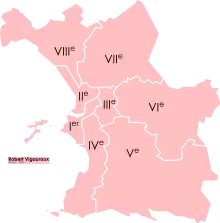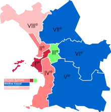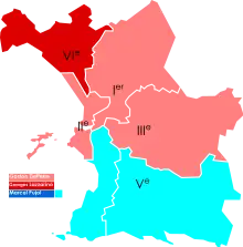 La ville de Marseille est découpée en 16 arrondissements municipaux en 1946. Ceux-ci sont regroupés en secteurs pour l'élection des conseillers municipaux depuis 1964[10]. Depuis 1982, Marseille relève de la loi dite « PML » : chaque secteur (six puis huit à partir de 1987) élit au suffrage universel direct un conseil dont un tiers des membres siège également au conseil municipal. Chaque conseil de secteur élit un maire de secteur et le conseil municipal élit le maire de Marseille.