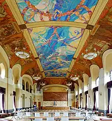 La salle des mariages lambrissée a été dessinée en 1886 par Ferdinand Humbert et Pierre Lagarde, qui ont réalisé les motifs allégoriques sur le plafond.