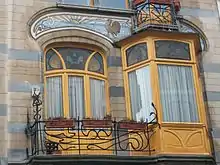 Les baies sont différentes aux trois niveaux. Au second étage, elles sont réunies en triplet. Au premier étage, le bow-window et la porte-fenêtre sont pourvus de verres américains sur leur partie supérieure. Un étonnant petit balcon surmonte le bow-window qui repose sur un culot ouvragé aux motifs végétaux. Une ferronnerie aux dessins complexes et élancés orne les balcons.