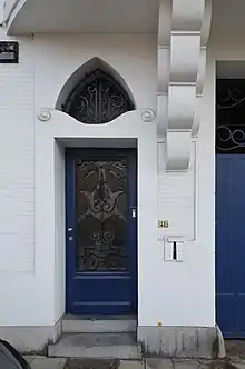Actuellement, la façade est peinte en blanc mais, à l'origine, elle avait un jeu chromatique de brique et de béton peint en blanc[1].