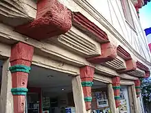 La façade est construite en pans de bois, formant encorbellement sur une galerie au rez-de-chaussée.