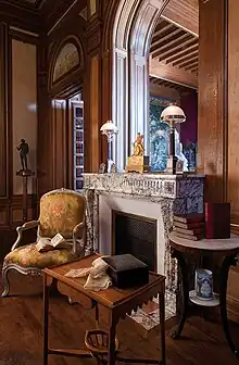 Le salon comporte un beau mobilier, majoritairement du XVIIIe siècle, ainsi qu’un lustre imposant électrifié qui conserve trois ampoules tricolores de l’époque de Louis Mantin. Autre particularité, la vitre au-dessus de la cheminée qui donne un point de vue direct sur le bureau. Pièce de travail, le bureau s’affirme comme tel par son atmosphère toute différente de celle du salon. Les boiseries cirées sont omniprésentes, rappelant l’intérêt du propriétaire pour ce matériau. On y trouve un bureau massif en bois sculpté et une bibliothèque. Enfin une cheminée monumentale, puisant largement dans le vocabulaire ornemental de la Renaissance, présente, incrustée en son centre, la reproduction d’une toile hollandaise en faïence de Delft. La plaque de cheminée, massive, offre à la vue de tous un « M » stylisé.