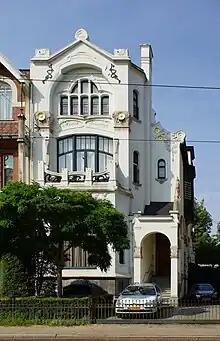 Réalisée dans un style proche du Jugendstil allemand, cette maison est surtout remarquable par les volumes de vides et de pleins que l'architecte a conçus. Des ornements floraux stylisés courent le long des baies qui sont totalement différentes à chaque niveau des façades peintes en blanc.