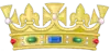 Mi-parti : de gueules aux chaînes d'or posées en orle, en croix et en sautoir, chargées en coeur d'une émeraude au naturel ; et d'azur à la bande d'argent côtoyée de deux doubles cotices potencées et contre-potencées d'or.
