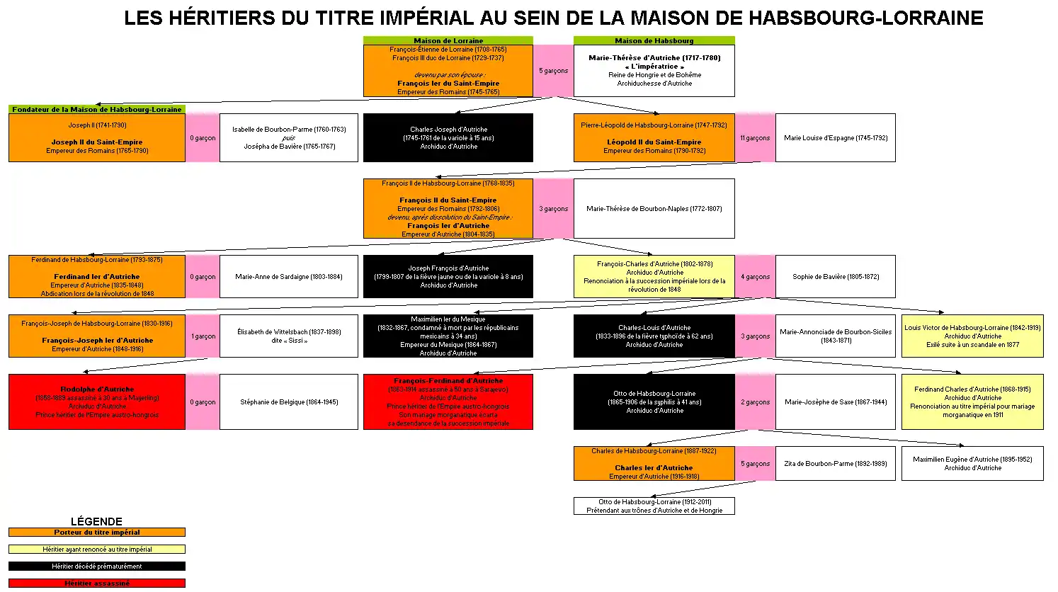 Seule branche légitime actuellement subsistante de la maison de Lorraine, les membres de la maison impériale et royale de Habsbourg-Lorraine sont issus du mariage de François III, duc de Lorraine et de Bar (1708-1765), et de Marie-Thérèse de Habsbourg (1717-1780), « roi » de Hongrie et de Bohême et archiduchesse souveraine d'Autriche, célébré à Vienne le .