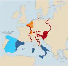 - en Europe centrale : archiduché d'Autriche, royaume de Hongrie, Bohême, Moravie, Silésie, Lusace, comté de Tyrol, duché de Carinthie, duché de Styrie, duché de Carniole, jusqu'en 1558 ;