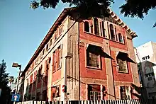 Construit en béton, avec un placage de briques rouges et de briques blanches, le bâtiment est unique et insolite à Tel Aviv par ses couleurs ses proportions européennes[2],[3].