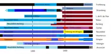 Rodolphe IV de Neuchâtel-Nidau[12], (? - ), comte de Nidau, seigneur de Frobourg, bailli du Thurgau et de l'Argau, seigneur de Fenis et de Cerlier, gardien de l'abbaye de l'Ile de Saint-Jean. En 1338 il prend le commandement de la coalition formée pour attaquer la ville de Berne à la demande de l'empereur. En 1350 il ratifie un traité d'alliance avec la ville de Bienne, en 1365 le dernier comte de Frobourg étant décédé sans enfant sa ville retourne dans les possessions des comtes de Nidau[9]. Sans enfants il désigne son neveu Rodolphe de Kibourg comme héritier.