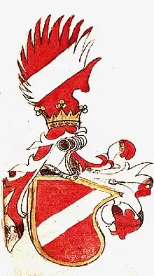 - De gueules à une bande d'argent, écartelé de gueules à une aigle éployée d'argent[2]