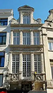 Plus haut, de part et d'autre du balcon du premier étage, deux bas-reliefs très abîmés représentent des enfants : ces bas-reliefs sont à rapprocher de ceux qui ornent la façade de la « Maison du Heaume » sur la Grand-Place de Bruxelles, réalisés par Frans Huygelen pour remplacer les originaux de Van Dievoet[5].