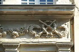 Ce pignon est encadré de volutes ornées chacune d'un motif ornemental mouluré appelé godron (motif d’ornementation en forme de cannelure en relief), d'une feuille de chêne et d'une patte griffue.