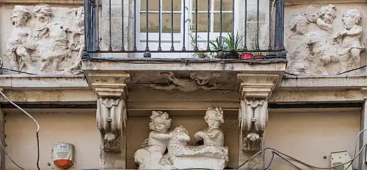 Le rez-de-chaussée, défiguré par un commerce moderne, conserve encore, au-dessus de la devanture moderne, un bas-relief représentant Jésus et Jean-Baptiste enfants jouant avec un agneau blanc. Au-dessus de ce bas-relief, sur la face inférieure du balcon, un autre bas-relief représente un aigle sur fond de nuages, tenant une couronne de lauriers dans son bec et un cartel (cartouche) dans une patte.