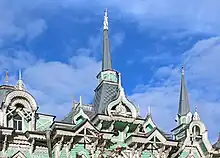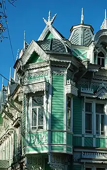 Cette maison de bois repose sur un socle de briques. Elle forme un plan en Г. La construction tridimensionnelle du bâtiment s'enrichit de risalits en saillie dont deux s'apparentent à des oriels par leurs contours à facettes, vérandas, balcons, vestibules, tambours. Particulièrement expressive est la véranda à oriel en baie vitrée, adjacente à l'angle du premier étage. D'un point de vue artistique, l'interprétation des finitions est d'une grande importance : de nombreuses flèches, des frontons carénés, semi-circulaires et triangulaires donnent une expressivité particulière à la silhouette de l'édifice. Grâce à cela, la maison a un certain aspect de « terem », influencé par le style russe d'Ivan Ropet. La sculpture sur bois joue aussi un rôle important dans la conception des façades[3].