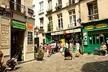 En 1904, les deux sections fusionnent[24]. C'est alors[25] que le Kemfer ouvre une bibliothèque yiddish qui, située 27 rue des Écouffes, sert aussi de salle de réunion et de conférence[26], sinon de masque au siège clandestin. C'est au cœur du Pletzl, alors peuplé à soixante et un pour cent d'Ashkénazes. Ceux ci sont à quatre-vingt-trois pour cent employés par l'industrie du vêtement, le plus souvent comme façonnier pour la confection. Très politisés, ils regardent leur langue comme l'instrument de leur émancipation[27] dans laquelle la bibliothèque a un rôle de premier plan. Au sein de celle ci, est dispensée une formation dramatique, la Fraye yididshe arbeter Bine[19], la Scène libre du travailleur juif.