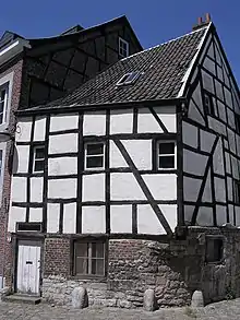 Cette maison d'angle possède un rez-de-chaussée bâti principalement en moellons de grès mais aussi en brique pour la partie gauche. Les étages (un niveau en façade, deux niveaux au pignon) sont réalisés en colombages avec pans de bois et briques recouvertes d'enduit blanc. Devant la maison, on peut encore observer trois bornes de pierre placées à cet endroit pour la protection de la bâtisse contre les heurts des charrettes[2].