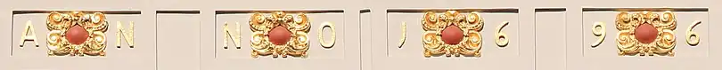 La façade est couronnée par un entablement dont l'architrave affiche l'année de reconstruction de l'édifice : « ANNO 1696 ».
