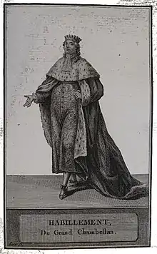 Elle est dirigée par le grand chambellan et a la charge des appartements du roi et de l'escorte de la personne du roi. C'est, avec la bouche, l'un des services avec le plus de personnel : elle compte dans ses rangs les quatre premiers gentilshommes de la chambre, les gentilshommes de la chambre, les valets de chambre, les pages, les huissiers et les enfants d'honneur. La proximité des officiers de la chambre avec le roi rend les charges très estimées.