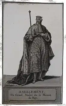 - la Grande Écurie, dirigée par le grand écuyer, dit « M. le Grand », qui s'occupe des haras du roi et du service des cérémonies (les hérauts et roi d'armes, les poursuivants d'armes, les porte-épées de parement, les pages et le corps des musiciens).