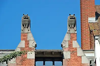 En effet, si la travée de gauche est couronnée par un grand sgraffite aux motifs végétaux stylisés surmonté d'une corniche en saillie, la travée principale, par contre, est sommée par deux pinacles couronnés chacun par un grand hibou en pierre bleue et disposés de part et d'autre d'une haute lucarne précédée d'un petit balcon.