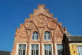 L'ensemble de cette façade est l'œuvre des prédécesseurs de la famille van 't Sestich, celle-ci s'étant contentée d'apposer son monogramme LX[3],[5] au-dessus du grand arc ogival (un jeu de mots sur son nom de famille, « zestig » voulant dire soixante en néerlandais bien que, rappelons-le, cette famille tire en fait son nom de la ville allemande de Sistig) et d'ajouter une encadrement en pierre calcaire autour des fenêtres[3].
