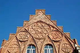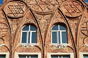 Au-dessus des quatre lancettes prennent placent trois grands oculi ornés chacun d'une étoile de David et de motifs tréflés[3].