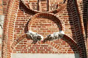 Chacune des quatre lancettes est ornée dans sa partie haute d'un motif trilobé agrémenté de créatures fantastiques en pierre blanche et d'un oculus en brique dans lequel est inscrite une croix[3]. Mais les deux oculi centraux ont été détruits et remplacés par des fenêtres qui semblent couronnées chacune d'un arc outrepassé, qui n'est en fait qu'un vestige de l'oculus.