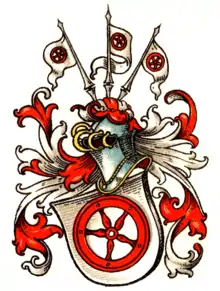 Le blason antérieur à ce mariage avec Cunigund von Stromede présente sur un plein blanc de gueule la roue rouge à cinq branches porté par le même lambrequin orné d'un même heaume de profil tourné vers la gauche.