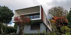 Le bâtiment est tourné de manière que seulement une petite façade soit visible depuis la rue et ne dévoile que très peu aux visiteurs ; une porte de garage et une fenêtre. On accède à la maison de manière latérale. Il faut descendre quelques marches pour arriver à la porte d'entrée. L'escalier se trouve sur la droite et l'on peut rejoindre l'étage de vie du rez-de-chaussée en montant et déboucher dans le séjour. Celui-ci est terminé par un balcon donnant une vue imprenable sur la vallée. Un couloir sur la gauche dessert les chambres, la salle de bains ainsi que le garage. Au sous-sol, sur la gauche de la porte d'entrée se trouvent l'atelier, le bureau et les locaux techniques. Depuis le pas de la porte d'entrée, quelques marches descendent vers le jardin.