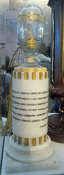 L'écrin qui contient le doigt est composée d'une base cylindrique en albâtre, surmontée par une coupe en verre à couvercle, décorée en or. Sur la base sont gravés les vers de Tommaso Perelli (1704-1783) :