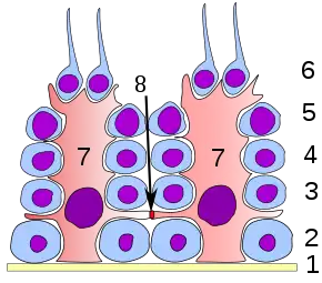 L'ACE2 est une enzyme de conversion des récepteurs cellulaires de l'angiotensine II[64]. Elle est présente sur les « cellules épithéliales alvéolaires AT2 » situées dans les alvéoles pulmonaires, mais aussi dans l'œsophage (dans les cellules épithéliales supérieures et stratifiées), dans les entérocytes absorbants de l'iléon et du côlon[64],[65] et dans le pancréas (de légères pancréatites sont d'ailleurs observées, via analyses d'amylase et de lipase et via l'imagerie médicale, chez les malades légèrement ou sévèrement atteints par la Covid-19[65]). Les « cellules à AT2 » sont connues pour être sujettes aux infections virales[66].