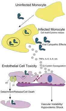 Une fois le virus dans la cellule, il sécrète la glycoprotéine soluble sGP et la glycoprotéine structurelle GP. La réplication du virus sature la biosynthèse des protéines dans les cellules infectées et notamment celles du système immunitaire de l'hôte. La glycoprotéine GP forme un complexe trimérique liant le virus aux cellules endothéliales qui tapissent l'intérieur des vaisseaux sanguins, tandis que la glycoprotéine sécrétée sGP forme un dimère qui interfère avec les granulocytes neutrophiles, un type de leucocytes, permettant au virus d'échapper au système immunitaire de l'hôte par inactivation précoce des neutrophiles. Ces leucocytes inactivés servent alors de transporteurs du virus à travers l'ensemble de l'organisme pour notamment contaminer les ganglions lymphatiques, le foie, les poumons et la rate[36]. La présence des particules virales et les dommages causées aux cellules par leur éclosion provoquent la libération de cytokines — TNFα, IL-6, IL-8, etc. — qui sont les molécules de signalisation cellulaire provoquant fièvre et inflammation. L'atteinte des cellules épithéliales par effet cytopathique conduit à la perte de l'intégrité vasculaire, aggravée d'une part par la glycoprotéine virale qui réduit l'efficacité des intégrines responsables de l'adhérence des cellules au sein des structures intercellulaires, et d'autre part par les atteintes hépatiques, responsables de la coagulopathie[37].