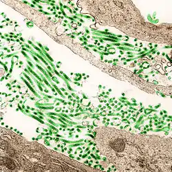 Il n'existe pas encore de vaccin ni de traitement spécifique homologué[6],[7], bien que plusieurs d'entre eux soient localement en cours d'essais cliniques sous le contrôle de l'OMS contre l'épidémie apparue en Afrique de l'Ouest en 2014, tels que le cAd3-ZEBOV, le VSV-EBOV, le favipiravir (Avigan), ou encore le brincidofovir. La prise en charge des personnes atteintes repose avant tout sur des soins palliatifs intensifs. Le virus se transmet à l'homme à partir d'animaux sauvages et circule ensuite au sein des populations humaines par contact avec les fluides corporels de personnes présentant les symptômes de la maladie (à l'issue de la période d'incubation), voire par voie entérale[8], mais pas par aérosols (voie aérienne)[9]. Des chercheurs pensent que des chauves-souris frugivores de la famille des ptéropodidés constituent le réservoir naturel du virus Ebola[7],[10], bien que les porcs aient été également impliqués dans la transmission d'un virus de même type[11].