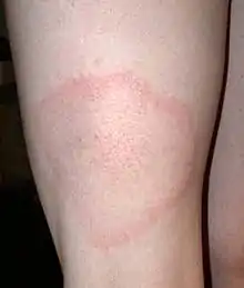 - En 1909, Arvid Afzelius (dermatologue suédois) avait noté l'apparition d'une autre lésion cutanée en forme d'anneau, suivant parfois une morsure de tique Ixodes, et qu'il appelle érythème migrant[1]. En 1913, Bruce Lipschutz (dermatologue autrichien) l'appelle érythème chronique migrant.