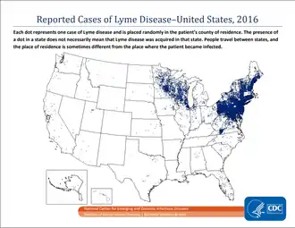 Aux États-Unis, près de 30 000 cas sont signalés chaque année aux CDC, dont 95 % des cas dans 14 États du nord-est et du Midwest, mais des études estiment que le nombre de cas diagnostiqués serait de l'ordre de 300 000, avec la même distribution géographique[40]. La prévalence de la maladie augmente aussi au Canada[41], notamment démontrée par un suivi de sérologiques chez les chiens ; en 2019, on estimait qu'un tiers des cas environ sont signalés dans les régions canadienne d'émergence de la maladie[42].