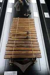 Xylophone, bálá. Culture Malinké. Afrique de l'Ouest. Bois, coton, courges, fibres végétales, papier, peau, résine. Muséum de Toulouse