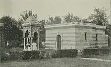 Le monument construit sur la sépulture est composé d’une grande dalle carrelée de 25m² surmontée d’un édicule polychrome de style indo-musulman aujourd’hui disparu.