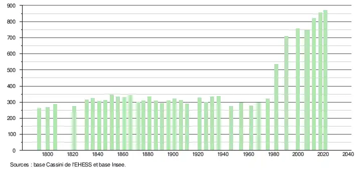 L'évolution du nombre d'habitants est connue à travers les recensements de la population effectués dans la commune depuis 1793. Pour les communes de moins de 10 000 habitants, une enquête de recensement portant sur toute la population est réalisée tous les cinq ans, les populations légales des années intermédiaires étant quant à elles estimées par interpolation ou extrapolation[23]. Pour la commune, le premier recensement exhaustif entrant dans le cadre du nouveau dispositif a été réalisé en 2007[24].