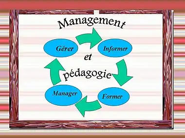 La pédagogie est d'abord un langage adapté à son ou ses objectif(s). Sur des concepts difficiles à saisir -comme le mot 'management' lui-même par exemple- elle s'appuie sur des comparaisons, des métaphores normalement mieux connues des participants ou a recours également à des métonymies en créant une relation logique entre deux réalités, procédés des sciences du langage qui permettent d'approcher des concepts indirectement en se basant sur les connaissances concrètes et syntaxiques des personnes en formation. et aussi on doit considérer les différentes notions de Gestions pour pouvoir déterminer laquelle des notions qu'on doit adopter.